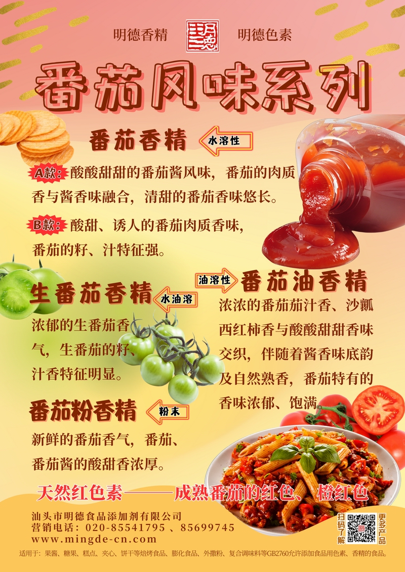 明德番茄风味系列香精 酸甜鲜爽 覆盖多样应用场景汕头市明德食品添加剂有限公司推出的番茄风味系列香精,覆盖水溶性、油溶性与粉末香精,兼顾番茄酱、鲜番茄与成熟番茄等多种风味调性。产品真实稳定,适用于饮料、酱料、烘焙、休闲等多种B端场景。