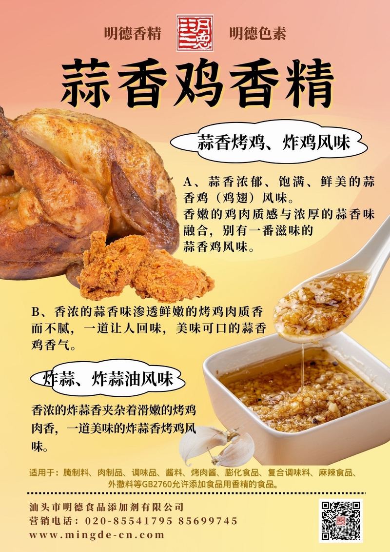 明德蒜香风味系列香精 多级蒜香 覆盖多场景汕头市明德食品添加剂有限公司推出的蒜香风味系列香精,覆盖水溶性、油溶性与粉末等多种形态,既能呈现新鲜大蒜、炸蒜、熟蒜油等不同调性,又兼顾耐温与留香表现,适用于酱料、肉制品、调味品、休闲零食及复合调味等B端应用。以下为本系列核心单品与香气描述