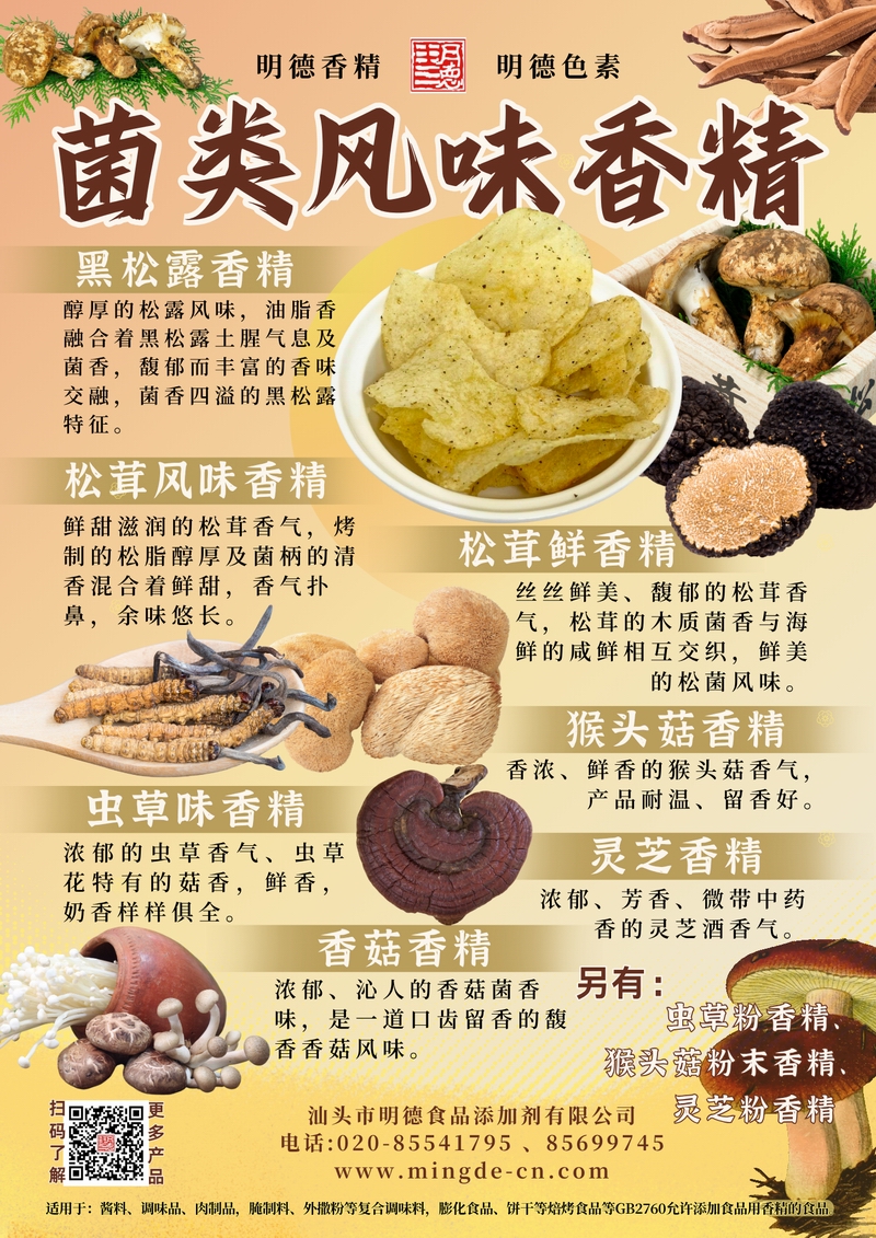 汕头市明德食品添加剂有限公司的菌类风味香精系列,涵盖黑松露、松茸、虫草、猴头菇、灵芝、香菇等多种风味,并配有粉末型产品。产品菌香真实、留香持久、层次丰富,适用于汤料包、酱料、调味品、肉制品、腌制料及外撒粉、复合调味料,膨化食品、饼干等焙烤食品等B端应用,帮助工厂打造具有辨识度的菌类风味产品。