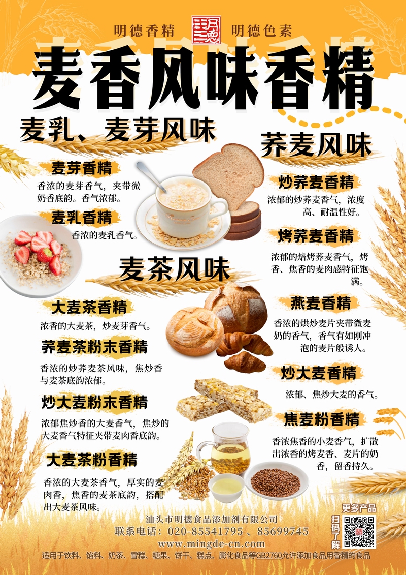明德麦香风味香精 谷物焙香 层次饱满汕头市明德食品添加剂有限公司推出的麦香风味香精系列,覆盖麦乳、麦芽、荞麦、大麦茶、燕麦、小麦粉等多种谷物调性。产品风味真实、层次清晰,留香稳定,适用于饮料、雪糕、糖果、烘焙与休闲零食等B端应用,帮助工厂快速打造具有记忆点的麦香风味。