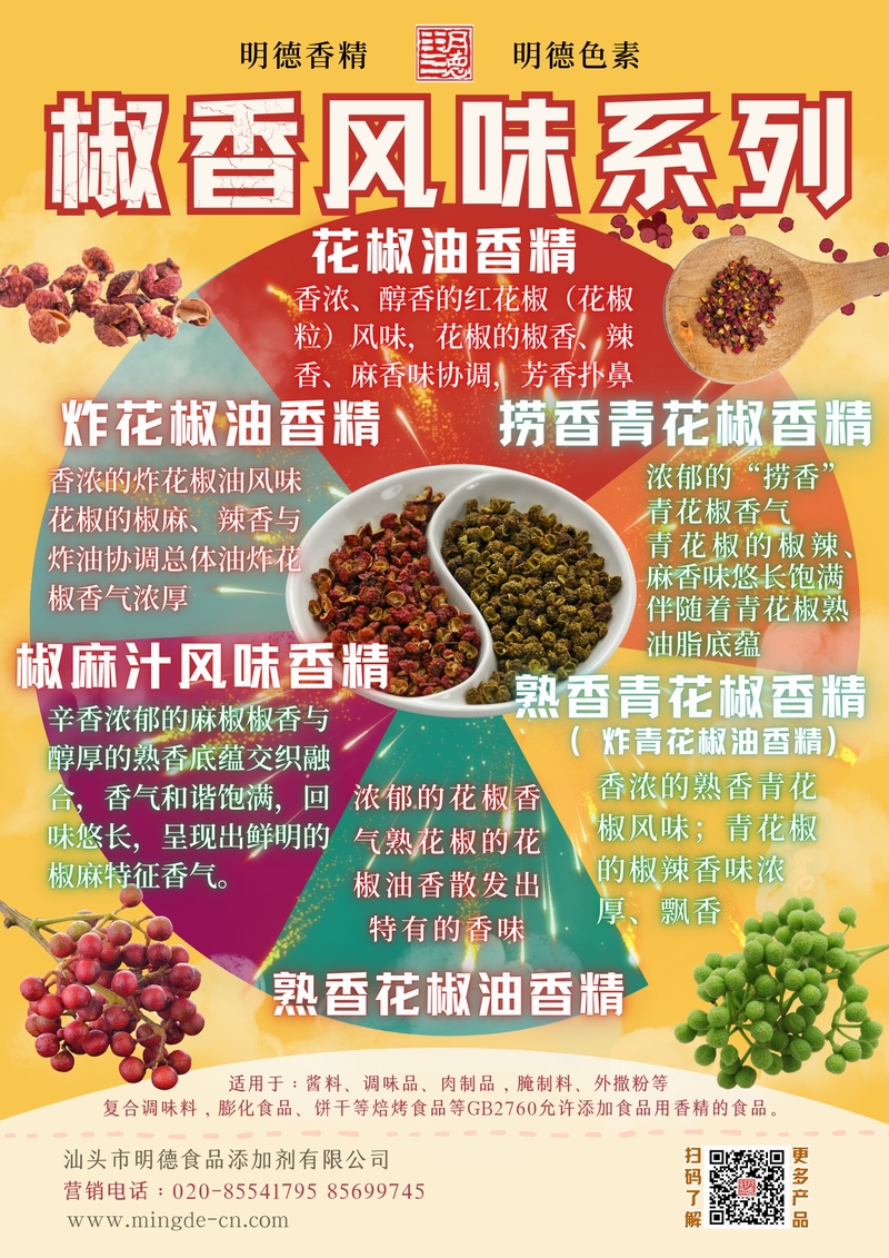 汕头市明德食品添加剂有限公司的椒香风味香精系列,涵盖花椒、炸花椒、捣香青花椒、椒麻汁风味、熟香青花椒及熟香花椒等多种类型。产品具有真实的椒香、麻香、辣香及油脂香特征,适用于酱料、调味品、肉制品、腌制料及复合调味料等B端应用,助力工厂快速打造风味丰富、层次鲜明的椒香产品。