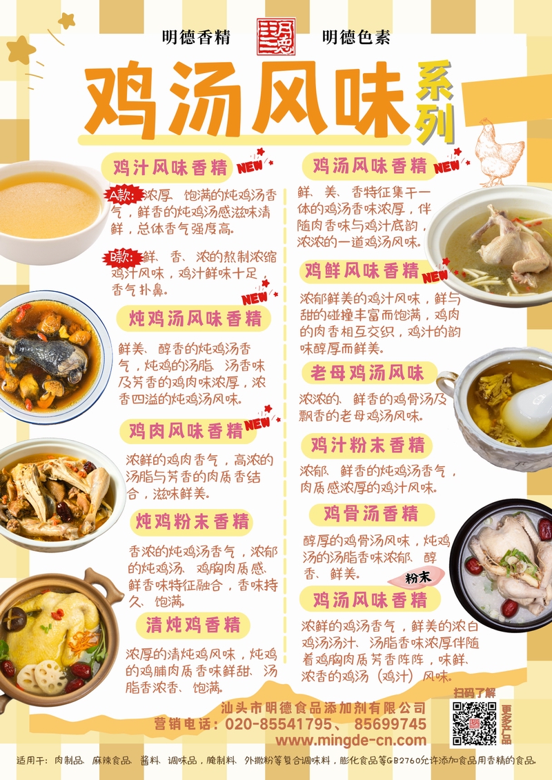 明德鸡汤风味香精 浓郁鲜香 还原地道鸡汤本味汕头市明德食品添加剂有限公司的鸡汤风味香精系列,涵盖鸡汁、鸡汤、鸡鲜风味、老母鸡汤、鸡肉风味、鸡粉末、鸡骨汤、清炖鸡等多种品类。产品具备真实的鸡肉鲜香、汤香、油香与骨香特征,能够为酱料、调味品、肉制品、腌制料及复合调味料等B端应用提供稳定、浓郁的鸡汤风味解决方案,帮助工厂快速打造风味醇厚、回味悠长的鸡香产品。
